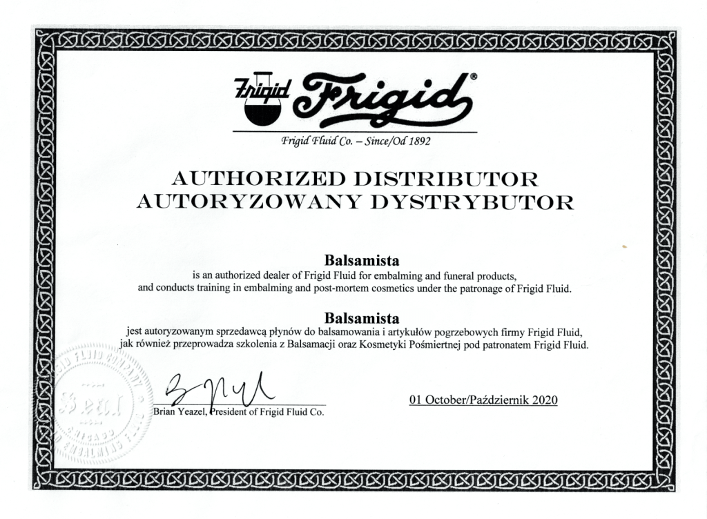 W Polsce jesteśmy wyłącznym dystrybutorem firmy Frigid Fluid — amerykańskiego lidera produkcji płynów balsamacyjnych o ponad 125-letniej tradycji. Ponadto, jako licencjonowany sprzedawca marki Instrument Design & Mfg. Co. LLC, oferujemy wysokiej klasy instrumentarium balsamacyjne, tworzone z myślą o wymagających profesjonalistach.